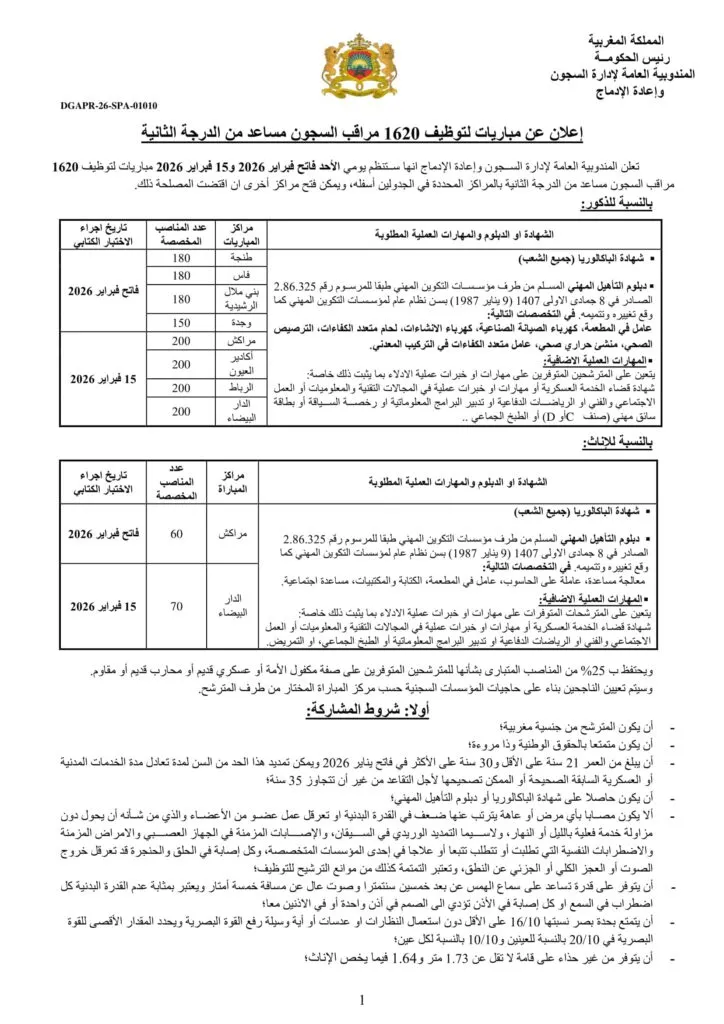 استنادًا إلى إعلان رسمي صادر عن المندوبية العامة لإدارة السجون وإعادة الإدماج، تم فتح باب التسجيل في مباريات توظيف 1620 مراقب سجون مساعد من الدرجة الثانية لسنة 2026، ويُنجز الترشيح حصريًا عبر البوابة الإلكترونية extranet.dgapr.gov.ma. في هذا المقال تجد كل التفاصيل الدقيقة كما وردت في القرار الرسمي، بصياغة مبسطة ومتوافقة مع السيو.